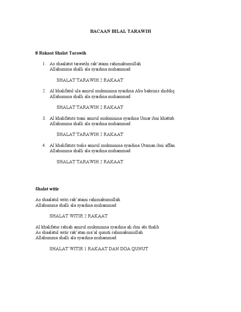 Bacaan bilal sholat tarawih dan witir 11 rakaat 1. Bacaan awal sebelum salat tarawih dimulai. Bacaan Bilal Shalat Witir.