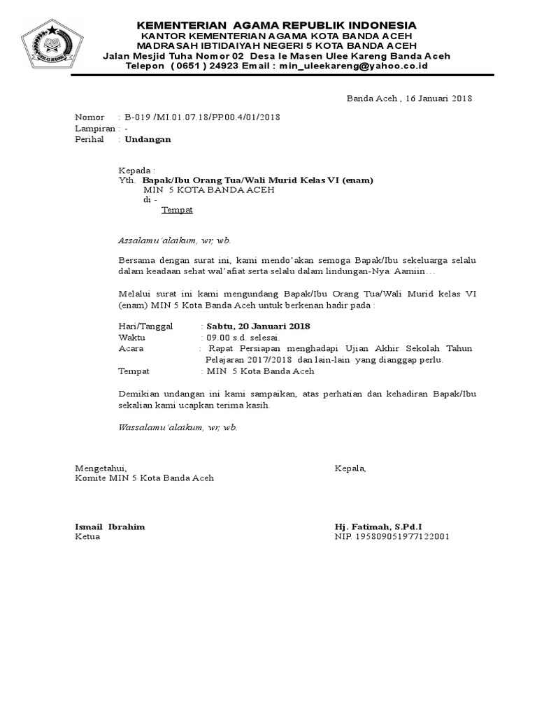 Contoh surat undangan wali murid pdf. Contoh Undangan TPQ Rapat Akhirussanah wali murid lomba dan kepentingan lain guna ketertiban TPA dalam administasi. Kami pihak sekolah selalu mendoakan semoga BapakIbu sekeluarga selalu dalam keadaan sehat walafiat dan mendapatkan perlindungan-NyaMelalui surat ini kami mengundang BapakIbu Orang TuaWali Murid kelas XII Dua belas SMA Negeri 7 Padangsidempuan untuk berkenan hadir pada Demikian pemberitahuan ini kami sampaikan atas perhatian dan kehadiran BapakIbu sekalian kami ucapkan terima kasih. Contoh Surat Undangan Rapat WaliOrang Tua Murid TK Surat Undangan adalah sebuah surat yang dikirim kepada seseorang agar orang yang dimaksud datang pada waktu tempat acara yang telah ditentukan.