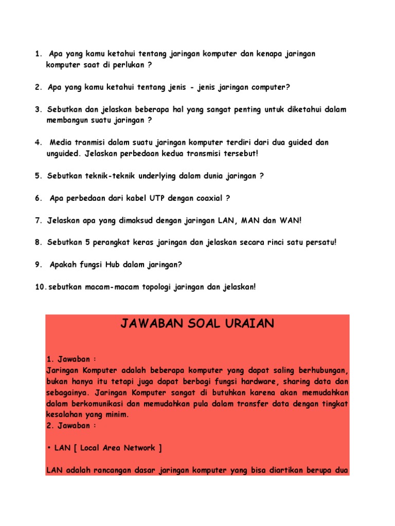 Sebutkan 5perangkat keras jaringan dan jelaskan secara rinci satu persatu. 4Sebutkan 5 perangkat keras jaringan dan jelaskan secara rinci satu persatu JAWAB. 10 Sebutkan topologi jaringan dan jelaskan kelemahan dan keuntungan dari masing-masing topologi tersebut.