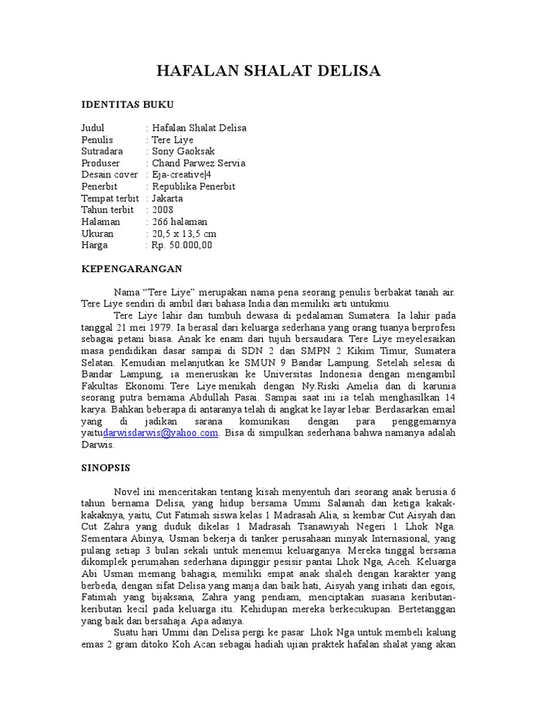 Sebelumnya malam itu Delisa bermimpi bertemu dengan umminya yang menunjukkan kalung itu dan permintaan untuk menyelesaikan tugas menghafal bacaan sholatnya. Ya Allah Delisa ditengan sadar dan tidaknya ingin sujud. Semoga bermanfaat Syukron ANALISIS UNSUR INTRINSIK DAN EKSTRINSIK NOVEL INDONESIA Hafalan Sholat Delisa Tere Liye UNSUR INTRINSIK Tema.